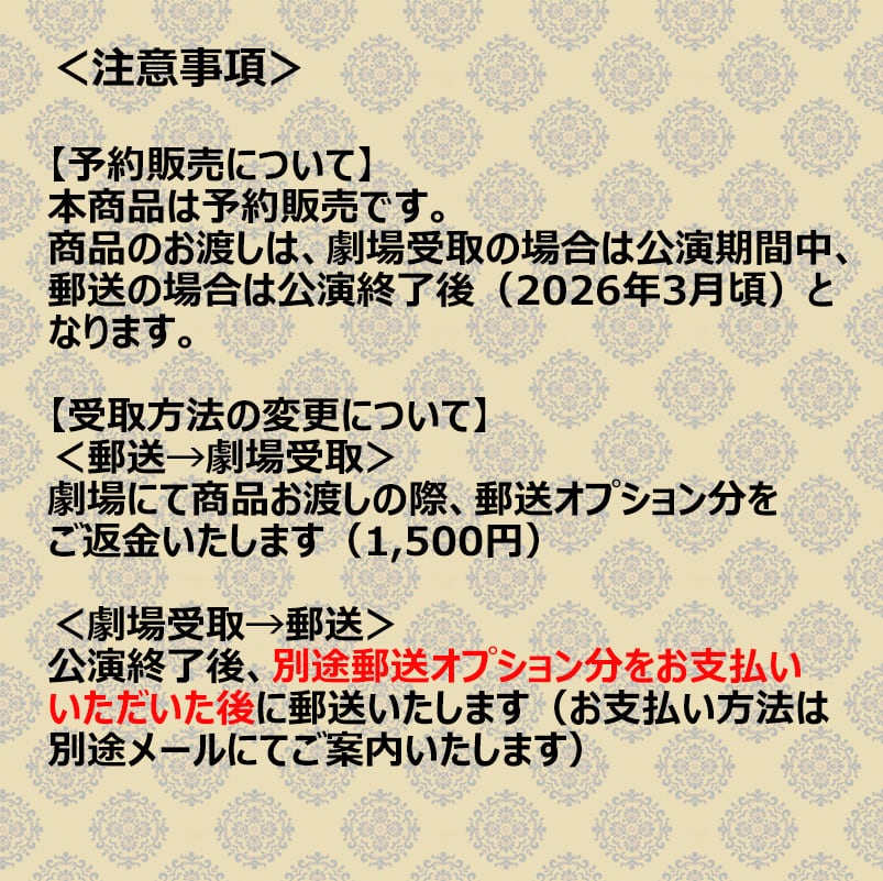 ・劇場受け取り→郵送への変更:公演終了後に送料オプションをご購入いただき郵送